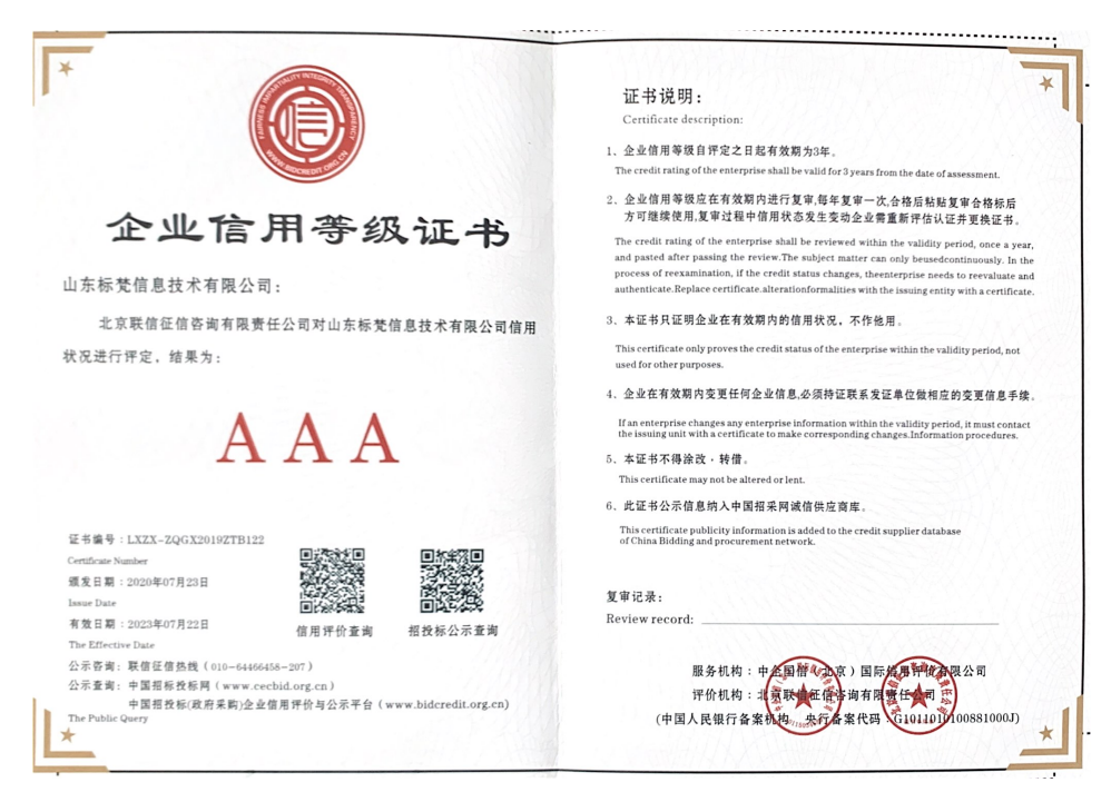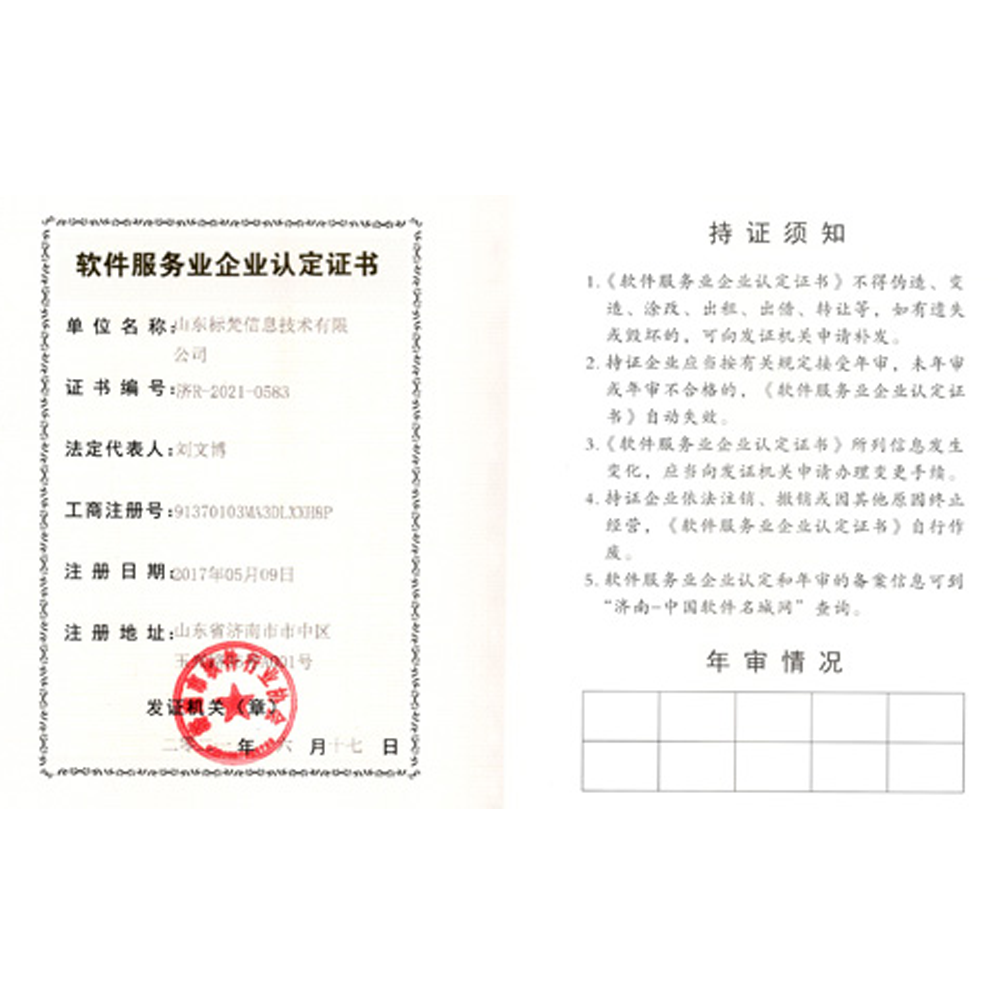 不僅具備正規雙軟認證,還獲得了AAA級企業信用等級證書,高新技術企業單位認證證書,知識產權管理體系認證證書,也是山東品牌培育管理體系實施指南電子信息行業標準的宣貫單位。