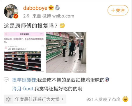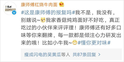 康師傅也在自己的官微上及時(shí)的跟進(jìn)和回應(yīng)熱搜話題,為自己的產(chǎn)品發(fā)聲。這波自黑式微博內(nèi)容營(yíng)銷,卻徹底扭轉(zhuǎn)了“蘑菇燉雞面”的銷量,使它成了風(fēng)靡一時(shí)的網(wǎng)紅方便面口味,也緩解了疫情之下“最不受待見”方便面的庫(kù)存壓力。