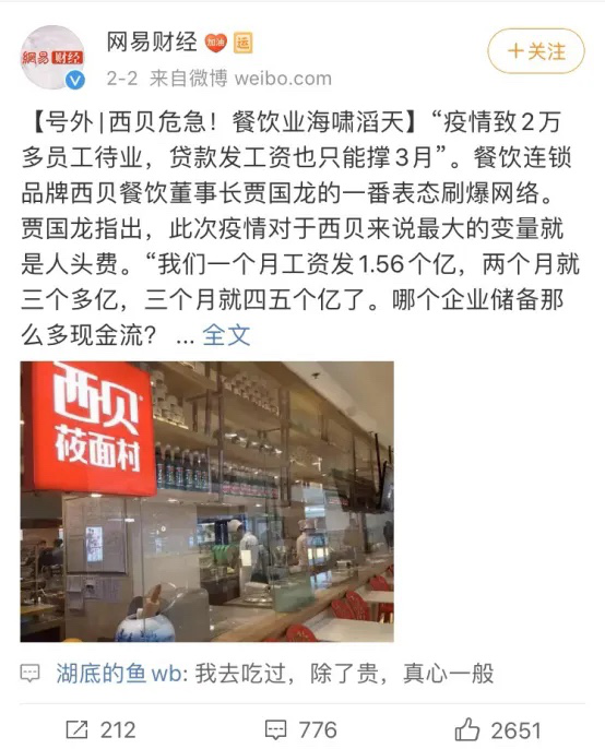 這個(gè)擁有300多家門店的西貝,年?duì)I業(yè)額超過(guò)60億元的巨頭餐飲集團(tuán),在疫情影響關(guān)店之后,賬上的現(xiàn)金卻只夠抗三個(gè)月。